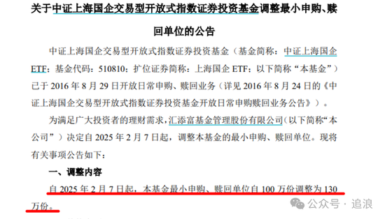值得注意的是,就在上海电气公告完成股票换购的前一日(2月6日),汇添富上海国企ETF发布了一条调整最小申购、赎回单位的公告,将基金最小申购、赎回单位自100万份调整为130万份,并从2月7日起正式生效。