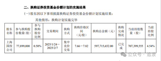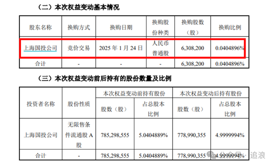 此次交易完成后,上海国投的持股比例从5.04%降至4.99%,不再属于持股5%以上的股东行列。